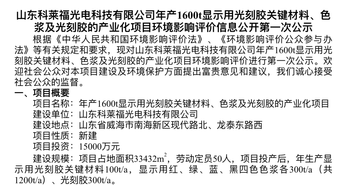 其中,光刻胶核心材料项目实施主体为山东科莱福光电科技有限公司,公司成立于2020年11月,法定代表人为颜俊雄,注册资本为1000万美元,企业地址位于山东省威海市南海新区现代路北、龙泰东路西化工园区内。